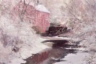 Snow at the Mill 16×20 Oil on linen. Many thanks to Pam Spice for writing this beautiful poem about my painting! Poem:“Snow at the Mill”…